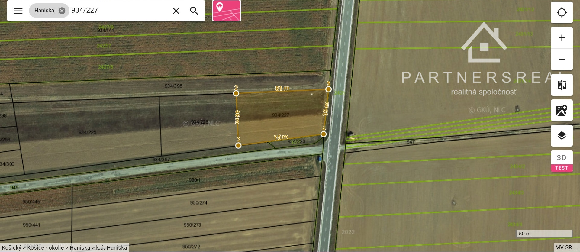 Vladimír Gaži a Partnersreal Vám ponúka exkluzívne na predaj zaujímavý pozemok situovaný na začiatku obce Haniska, v extraviláne obce, mimo zastavaného územia.
